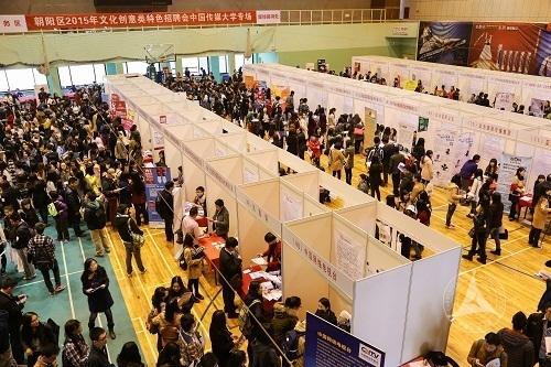 (新闻中心记者 储钰琦 韦禄吉 通讯员 魏蔚 摄影 虞东升 李澎丰)3月25日下午,由我校就业指导中心、朝阳区人才服务中心、朝阳区委宣传部联合举办的“朝阳区2015年文化创意类双选会(中国传媒大学专场)”在我校体育馆成功举行。中国网络电视台、凤凰网、时尚传媒、英皇文化等108家文化创意企业现场招聘,提供了约1500个岗位;中国传媒大学、北京第二外国语学院、中央财经大学、北京工业大学等多家高校的毕业生约10050人次前来应聘。在招聘会现场,毕业生与用人单位进行了积极的沟通,初步达成意向共计785人,现场签约见习实习81人。