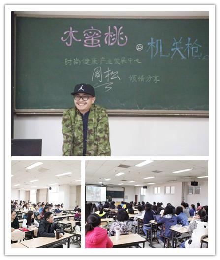 在讲座的开场,周松首先向同学们解释了讲座标题——《水蜜桃与机关枪》的含义和故事。他说,标题是一个很重要的包装工作,要根据自己前期预定中想要吸引的目标人群来设定标题。随后,周松以跑步与恋爱等几个简单的小故事和问题带领观众进一步展开谈话,并结合自己在《时尚健康》做主编期间做的相关活动和故事向大家分享他的心得体验。“跑步是当下最流行的运动,是将来最时尚的运动。”他从自己跑步的经历出发,和同学们展开漫谈,分享了自己在跑步中遇到的人或事和从中收获的“跑得越远离自己的内心越近”等道理,并将话题引申到自己最爱的电影《死亡诗社》,邀请大家全体起立朗诵诗句,回答学生的提问,与现场同学进行了热烈的互动。