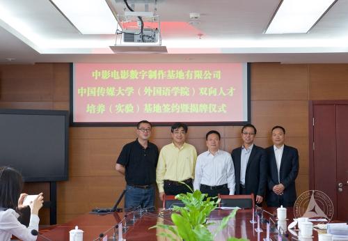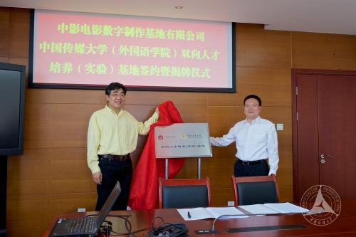 仪式上,王宜凤副经理与李佐文院长签署双方合作协议。雷振宇总经理与袁军副校长共同为中影电影数字制作基地有限公司、中国传媒大学(外国语学院)双向人才培养(实验)基地揭牌。