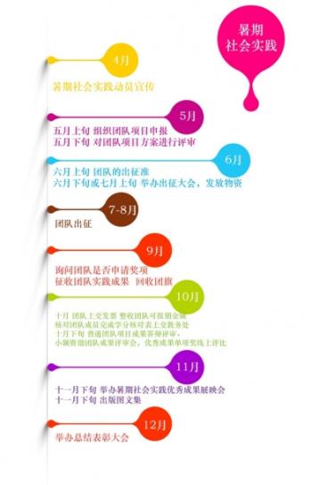 暑期社会实践是由校团委主办,校团委实践部承办的一项活动。通过组织在校学生在每年暑假期间以个人或学院、组织的形式参与包括主题调研、志愿服务、专题考查、科研学术、公益社区、环境保护等各种类型的社会实践活动,达到锻炼和提高大学生实践能力、充实大学生活的目的。