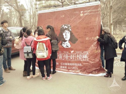 当然,过分强调某一节日可能会让人们忽视它的初衷,“为了过节而过节”,使“只在母亲节才想起关心母亲”这种荒谬的现象再次发生。要像雷锋一样,把有限的生命用到无限的为人民服务中,就要把志愿活动落实到生活的点点滴滴中,用志愿精神感化更多人。为了扩大雷锋周的影响力,使“雷锋精神”得到更加广泛而深刻的传播,青协还在48教前坪组织了“学习雷锋好榜样”签名活动,并通过一场别开生面的“ 手语快闪”,以手语舞的形式演绎歌曲,宣传雷锋周活动,号召更多的人加入志愿者队伍。