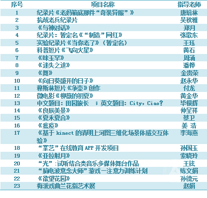 本次申报包括纪录、剧情、动画短片,游戏、交互、话剧、mv以及其他8个类型共53个项目,由校内14位专家进行了网上初评,筛选出37个项目参与最终评选,共有23个申报项目通过。评审专家秉承“艺英培育计划”一贯的理念与原则,提出了宝贵意见和建议,尤其强调作品创新性与学生自主性,并对开展“艺英培育计划”的重大意义与艺术学部师生的创作能力给予了充分肯定。