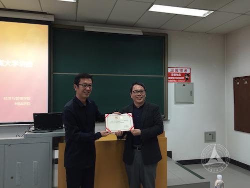 侯鸿亮先生受聘广播电视专业艺术管理方向专业硕士研究生业界导师。在本次讲座中,经济与管理学院张树庭院长为他颁发了证书。