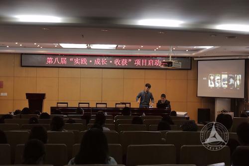 随后,第七届“实践·成长·收获”公益实践活动的两个优秀项目组做了项目展示和经验分享。“报刊亭:夹缝中生存的城市名片”项目组代表袁嘉咛同学用幽默风趣的语言分享了他们在实践中的经验和教训,“探寻钧瓷文化”项目组代表刘毛宁用激情高昂的发言鼓励同学们要坚持初衷,做出优秀的项目成果,不辜负团队的共同努力。