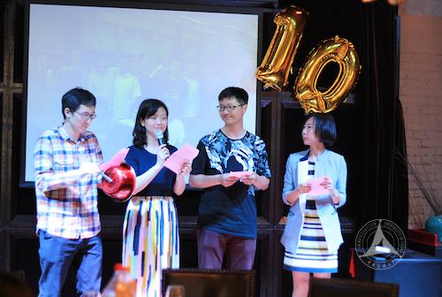中午,老师和同学们在餐厅集合,共进午餐。会场以蓝色为基调,整体布置隆重、高雅,充满童趣和温情。大家制作了回忆短片,重温班歌,一起回味大学四年的点点滴滴。“国贸二代”的小朋友们集体做了自我介绍,并向几位老师送上了纪念品。同学们自编自演了三句半《十年一聚》,通过幽默的语言展现了彼此十年的成长和变化。
