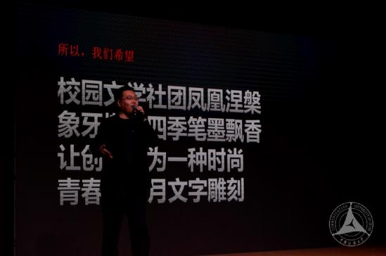 中国校园市场联盟秘书长单兴华讲道,总要有人给校园文学创作者一个平台,总是要有人给青春文学开一条路,而他正是这样一个情系校园,不忘初心的人,他希望校园文学社团凤凰涅槃,让象牙塔内四季书墨飘香,让文字成为时尚。希望校园里的年轻人再接再厉。