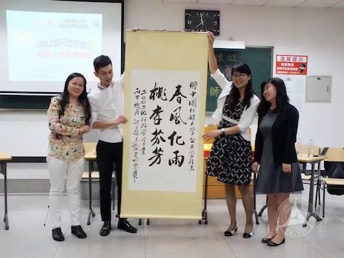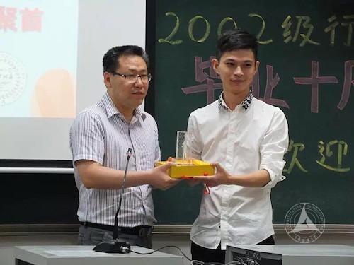 活动最后,2002级行政管理班专业的同学们还分别为学院和系里送上了一份他们精心准备的礼物,“春风化雨,桃李芬芳”充分表达了校友们对老师淳淳教导的感激之情。