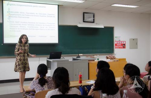 会谈结束之后,Matilde教授面向葡萄牙语专业的学生进行了关于巴西葡语水平测试Celpe-Bras的专题讲座。首先展示了Celpe-Bras的创办历史和发展情况,之后详细阐述了考试各部分的题目和评分标准。Matilde教授举例说明了考试中对考生交际能力的要求,深入浅出地帮助学生审题、判断、分析答题,并且从语言应用的角度提出外语教学中应当注重学生交际能力的培养。 葡语专业教师、外教和学生,以及北京第二外国语学院、北京交通大学和澳门科技大学的葡语专业师生参加了此次讲座,并且与主讲嘉宾进行了互动探讨。