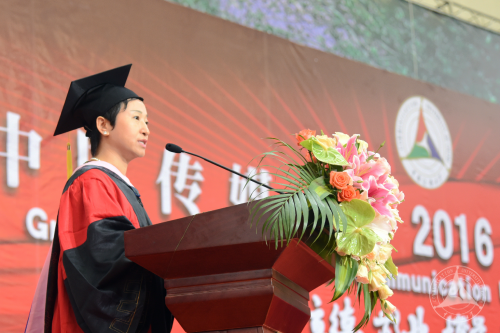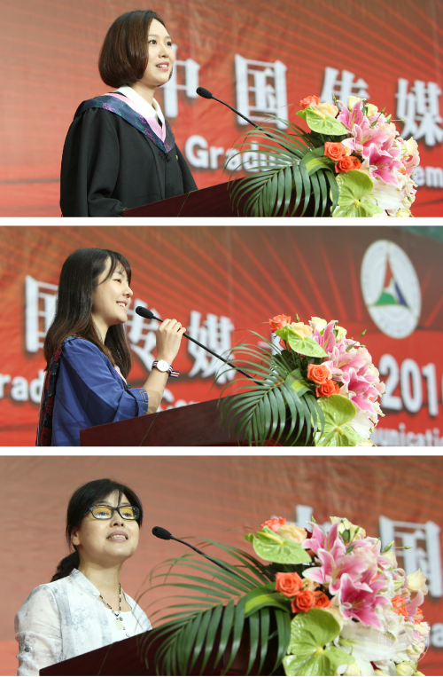 本科毕业生代表2012级播音主持艺术专业刘柏伶、研究生毕业生代表 2013级广播电视艺术学专业研究生陈雨璇、家长代表龚丰玲分别发言。