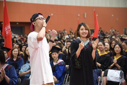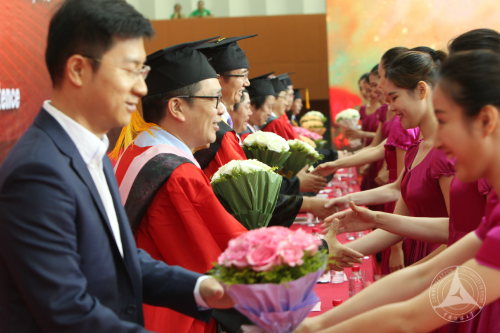 在热烈的掌声和欢快的乐曲声中,毕业生代表向校领导、校学位委员会委员、各学部(院)领导及导师代表敬献了鲜花。
