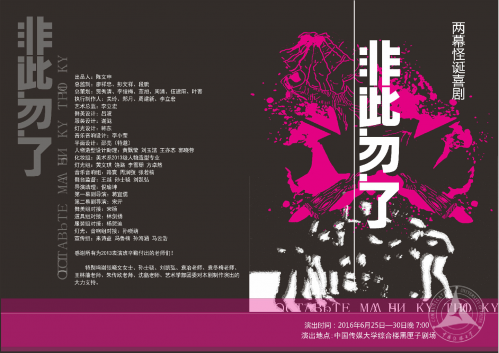 《非此勿了》(编剧:阿·格·伊瓦先科)是一部两幕荒诞喜剧,剧中围绕着一名中学地理老师奇特的梦之旅,展开了一系列让人啼笑皆非、光怪陆离的故事,展现了在旧有体制中知识分子的中年危机和僵化体制的弊端。主创团队全部来自艺术学部的专业教师,包括舞美设计吕波;人物造型设计谢滋;灯光设计韩东;音乐音响设计李小莹;以及导演——表演专业孙德元副教授、研究生王越。