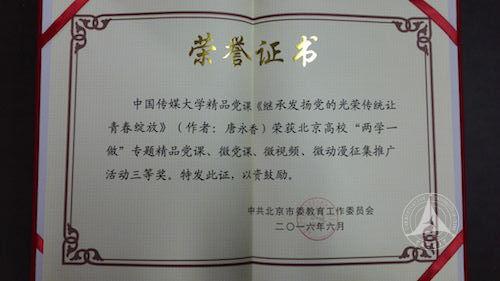 (通讯员 龙俊)为创新学习教育形式,积累学习教育资源,抓好“两学一做”学习教育,近期市委教工委组织开展了北京高校“两学一做”专题精品党课、微党课、微视频、微动漫征集推广活动。我校各基层党组织积极参与申报工作。经市委教工委评定,我校外国语学院和继续教育学部联合报送的精品党课“继承发扬党的光荣传统,让青春绽放”荣获三等奖。