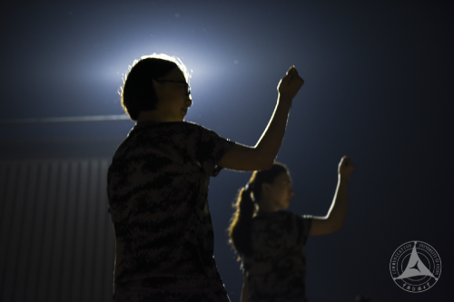 国旗班采用的是“好中选优”的选拔机制。初次挑选国旗班成员是在一个晚上,在教官的指挥下,同学们一排一排地正步走过,展示训练成果。第一轮选出了六十多个同学。经过第二天的训练和竞争,有三十多位同学留了下来。此后,每一天还会有内部的淘汰机制。“国旗班训练的强度特别大,又是在如此的高温条件下,但真的是每一个人,我能看到每一个人都在很努力。” 张钿悦觉得,她们努力坚持下去的理由有很多,但最重要的还是集体的荣誉感。