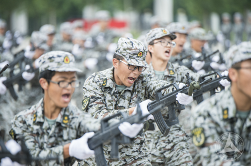 在接下来的部分军训科目汇报表演中,内务、军体拳、刺杀操、旗语、匕首操、擒敌术、队列等方队按顺序出场。同学们整齐的动作、抖擞的精神和整个团队的威武的气势,一次次赢得在场领导、老师和同学们的掌声。其中,首次设立的擒敌术表演,可以说是全团训练科目中难度最大的。小伙子们虽然从有一定基础的同学中选出来,但在练习中也难免磕碰。他们出色的表现,体现出传媒男生的血性和坚强。随后的拼图组字,作为历届军训表演的保留科目,传承中不乏创新,先后拼出“CUC、中国传媒大学”的文字和军徽、党徽以及白杨树等图形。
