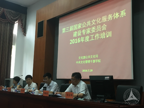 (通讯员 魏晓阳)2016年7月29日,第三届国家公共文化服务体系建设专家委员会2016年度工作培训在中央文化管理干部学院举办,公共文化司张永新司长,陈向红副司长,第三届国家公共文化服务体系建设专家委员会顾问和专家委员,我校经管学部文化发展研究院在内的五个文化部公共文化研究基地负责人共计60余人参加了本次培训,培训由文化部公共文化司与中央文化管理干部学院共同主办,陈向红副司长主持。