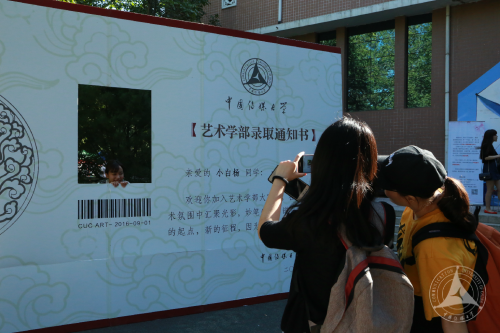 艺术学部的迎新活动则处处彰显着学部迎新的主题——“扬帆”,从迎新场地小礼堂的入口到场内场外的装饰都充满了艺术气息,大型的“艺术学部录取通知书”展板引人注目,吸引不少新生在这里留影纪念。