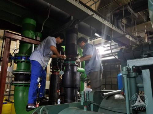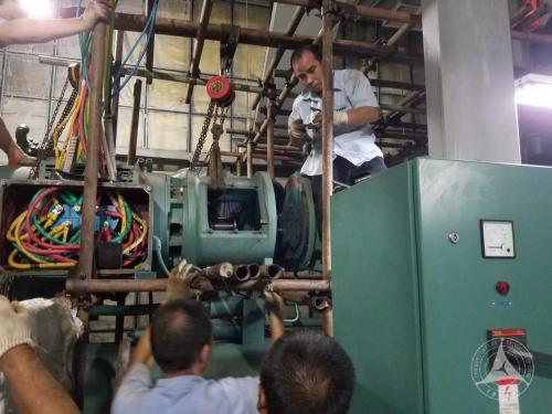 为不影响到工作与学习,后勤管理处安全管理中心采用逐一维修法展开修理。中央空调制冷主机机体庞大沉重到以至于无法单由人力挪动,工人需要用多条钢管将机组整体固定后,再用撬杠将压缩机与主机分离使用起重机吊起,该部件净重超过1吨,其利用制冷剂在气态与液态的压缩变化中源源不断的产生冷媒,是整个系统的心脏,因其重要性需要返回位于江苏无锡的原制造厂进行全面检修,其余零配件均于现场进行更换。常年使用的制冷系统管道阀门已锈迹斑斑,后勤管理处安全管理中心工作人员对所有阀门进行了一次详细的检测,凡有发现渗漏故障的一律更换,使稳定制冷、设备安全得到有力的保障。