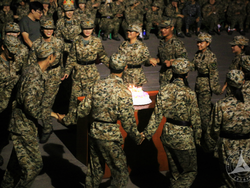 最后,四名护旗手捧出点燃18根蜡烛的四个大蛋糕,过生日的同学分成四组,围在蛋糕前许愿吹蜡烛、共庆成人礼。“祝你生日快乐,祝你生日快乐”的歌声再次响起,在场同学再次感受到了集体的温暖和军训的快乐,有的同学的眼里已经含满了激动的泪花。分享完蛋糕,带着节日的欢乐,各连分别带回。月上中天,基地恢复了往日的平静。