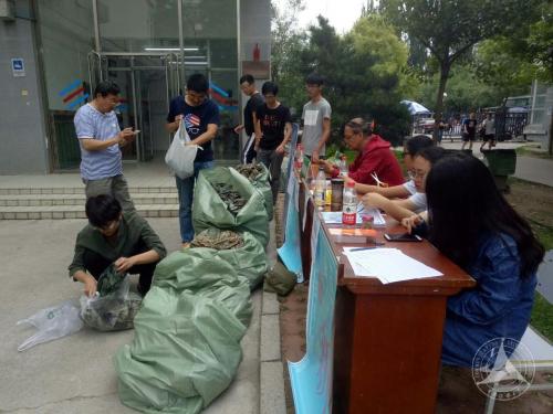 在军训结束前,学校向参加军训的2016级新生发出倡议,动员大家在军训结束后捐赠军训服装。我校自强社也通过微信公众平台发布了军训服回收的召集令,得到了广大新生的支持,他们纷纷表示愿意参与到公益捐赠中来。17日下午两点,自强社的成员们早早带好展板、登记表、麻袋等物资,赶赴活动开展地进行摆台回收工作。军训基地返校的2016级新生陆续来到军训服捐赠处,在自强社同学们的帮助下,将上衣、裤子和鞋子分类装入相应的麻袋并完成登记。