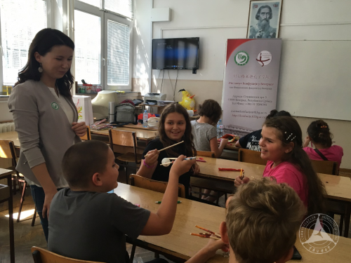 2016年9月17号首先在Vuk Karadzic小学进行的文化体验活动是“筷子比赛”。筷子是中国的传统餐具,开始时孩子们使用起来还稍显笨拙,不一会儿一个个就学会了夹东西。一个9岁的小男孩立刻把自己的妈妈、弟弟和阿姨一起拉入体验活动,让弟弟一起说汉语和用筷子,而让妈妈在旁加油。趁热打铁,活动开始了小组车轮赛,每组每次夹起乒乓球或者豆子时间最长的人获胜。经过角逐,5位小朋友获得了胜利和孔院教师赠送的精美小奖品。那个9岁的男孩获得了一个“全球孔子学院日”活动纪念钥匙环和一双筷子,他兴奋地要妈妈以后也和他一起学汉语。