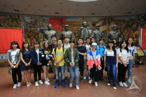 平津战役纪念馆位于天津市子牙河桥西侧,于1997年建成。该馆是反映中国解放战争三大战役之平津战役的纪念馆。展馆巨大的牌楼式眉额上还有聂荣臻元帅亲笔题写的"平津战役纪念馆"七个金色大字,大家在此拍完合影,一行人进入馆内,在讲解员的带领和解说下开始参观。同学们被大厅正中的铸铜雕像《走向胜利》和巨幅壁画《胜利交响诗》吸引,领略了毛泽东、刘少奇、周恩来、朱德、任弼时等领袖的风采,并被战士们英勇奋战,夺取战争胜利的精彩场面感动。继续深入展厅,便是毛泽东主席西柏坡办公室复原蜡像和反映那个战火纷飞年代的珍贵画作文物等。讲解员解说完毕后,同学们还意犹未尽,在展厅内四处观看,感受历史的痕迹,经受心灵的洗礼。