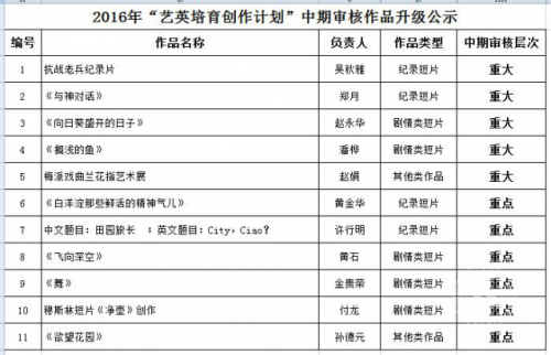 本次中期验收的作品包括纪录片、剧情类短片、话剧和舞台作品、交互类作品、游戏类作品、动画短片和其他共7个类型,23个项目。答辩项目被分为三组,由各项目指导教师和学生代表共同参与汇报。汇报项目分别展示了本项目的现有成果、经费使用情况、现存问题和进度安排。评审专家秉承“艺英培育创作计划”一贯的理念与原则,本次评审继续实施项目升级制。评委们对开展“艺英培育创作计划”的重大意义与艺术学部师生的创作能力给予了充分肯定,并对每个项目的创作提出了相应的意见和建议。经过专家打分评议,有5个项目升级为重大项目,6个项目升级为重点。具体升级名单见下表: