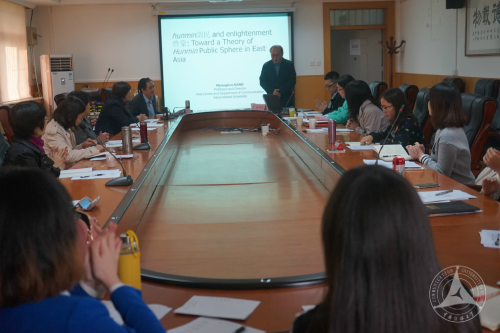 (通讯员 张寒 摄影 刘开华)10月13日—10月14日,韩国首尔大学教授、亚洲研究中心主任姜明求应我校马克思主义学院、外国语学院邀请在我校举办系列讲座。姜教授首先在马克思主义学院做了两场《国家 国民 训民社会》(上、下)的讲座。在第一场讲座中,姜教授详细讲述了“训民公共领域”(Hunmin Public Sphere)概念的提出及其意义,从词源意义上比较了东亚社会(中国、日本、韩国)与欧洲国家对“公共领域”理解的不同,及其在国家(Nation)、市场(Market)、市民社会(Civil society)、日常生活(life world)结构中所处的不同位置。