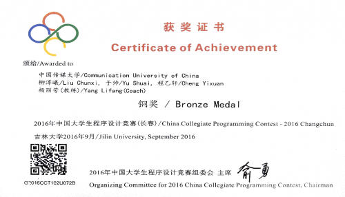 (通讯员 杨丽芳 王楠)10月10日,从第二届中国大学生程序设计竞赛(China Collegiate Programming Contest, 简称CCPC)组委会获悉,由理工学部杨丽芳老师担任教练,由15级信息安全专业于帅、13级录音工程专业柳淳曦和14级信息安全专业程乙轩组成的参赛队伍获得铜奖。