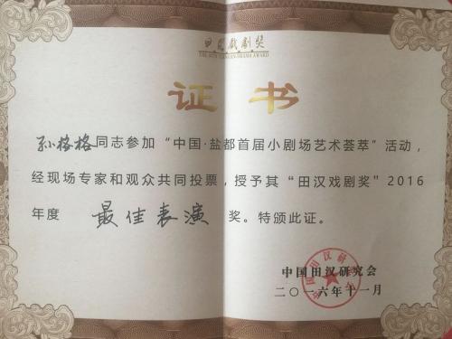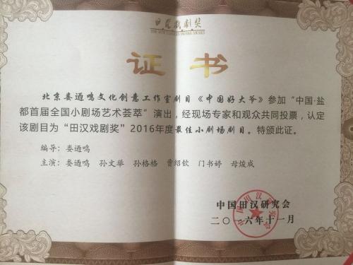 (通讯员 朱星辰)12月1日,为期七天的中国•盐都首届小剧场艺术荟萃圆满闭幕。当晚,艺术荟萃压轴好戏——由我校艺术学部表演专业2012级表演本科班毕业生孙格格、母焌成、曹绍钦参演的话剧《中国好大爷》荣获“田汉戏剧奖”2016年度最佳小剧场剧目;孙格格更是凭借张大爷一角,斩获最佳表演奖。