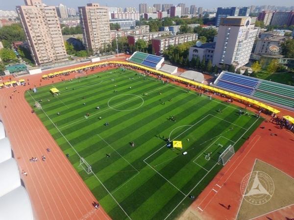 原南操场。扩建后的体育场面积达60000多平方米,形成地下三层、地面一层的立体格局。地面集足球场、400米环形跑道和篮球场等众多体育运动设施为一体,是学生开展体育文化活动的综合场所,地下则建有停车场、学生文体排练厅等设施。“北有活动中心,南有体育场”,构成了学校综合性的文体运动中心格局。