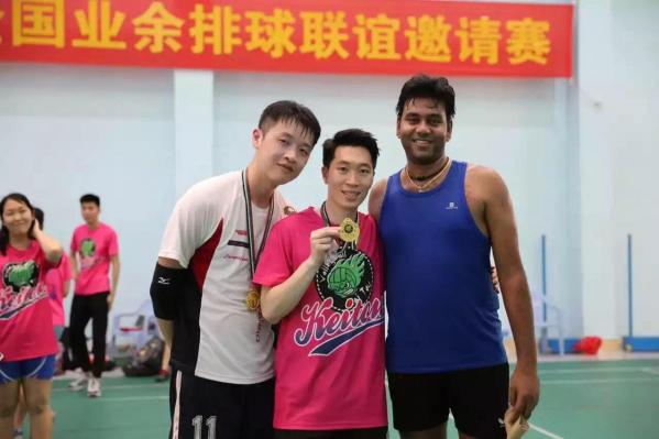 因此,我要坚持我的梦想,将来,无论是回到祖国还是继续在中国生活,无论条件是否艰苦,我都会不懈地为推广排球运动做出自己的贡献,用女排精神感染更多的人。两年前,由北京市大学生体育协会排球分会主办的2014年首都高等学校沙滩排球联赛在清华大学展开。作为唯一的留学生队员,我和我的伙伴们代表中国传媒大学校排球队参加了北京市首届大学生沙滩排球比赛。本次沙排联赛男子组共有16所高校代表队参加,分为4个小组。我校男队以小组第二名的成绩进入8强,在1/4比赛中,顺利淘汰中国矿业大学队。半决赛对阵拥有主场优势的清华大学队,场上我和队员们发挥稳定,干净利落的以2:0拿下比赛。决赛对阵的是北京航空航天大学队,我们在开局落后的不利局面下,沉着冷静,奋勇拼搏,迅速反超比分,最终以2:0赢得比赛胜利,问鼎了本次沙排联赛的冠军。在比赛中,我们一起发扬着女排精神,在生活中我也在用实际行动努力地实现着自己的梦想——为推广排球运动做出自己的贡献,用女排精神感染更多的人!