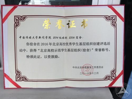 令李子尧没想到的是,新闻学院只有他们一个宿舍提交了资料,“从班长手上拿到这个奖状,也是挺激动的,毕竟是一个北京市的奖”。我校共有三个宿舍获得该荣誉,梆子井二号楼2306宿舍便是其中之一。