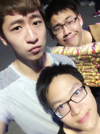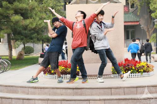 大二时他们参加我校社团联合会举办的“宿舍默契大比拼活动”,获得了一等奖。在孔子广场前,三人拍了一张搞怪的合照。