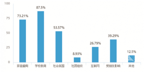 当看到水流不止(在不赶时间的情况下),有98.21%的同学选择立即关闭或提醒相关负责人、拨打报修电话;如果作为最后一位离开教室或寝室的同学,有89.29%的学生选择“通常会随手关灯”,较少同学选择“偶尔会随手关灯”;这样自觉的环保观念,与学校教育是密不可分的。在“您的环保知识来自哪里”的问题中,87.5%的同学选择了“学校教育”,在所有选项中是比例最高的。此外,另有 73.21%的同学选择“家庭熏陶”,53.57%的同学选择“社会氛围”,39.29%的同学是“受朋友影响”,26.79%的同学从互联网中获取环保知识,8.93%的同学在社团组织中形成了环保意识。可见学校、家庭、社会氛围对环保观念的形成有极其重要的作用。
