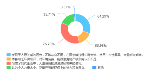 在环保观念上出现问题后,76.79%的同学认为这是因为大家习惯了现代生活,迷恋大量使用能源资源所带来的便捷。64.29%的同学觉得自己受限于人际关系的压力,不敢与众不同,在聚会等过程中往往随大流,使用一次性餐具、大量剩饭剩菜。有35.71%的同学觉得大学生节能环保的问题出在“认为个人力量太小、花费在节能环保上的努力没有意义”。还有33.93%的同学认为是因为“本身缺乏环保知识,对环境污染、能源浪费的严峻形势认识不足。”