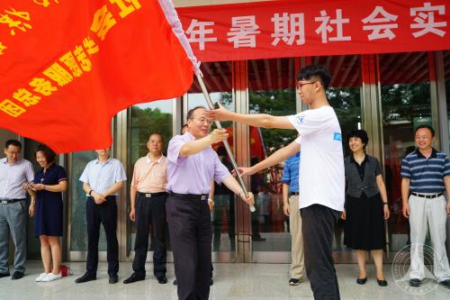 在出征仪式的授旗环节中,到场的各职能部门领导为即将出征的校级团队代表授社会实践志愿服务团旗,各学部(院)领导为各自学部(院)团队授社会实践志愿服务团旗。最后,刘守训副书记授出了今年社会实践的总团旗和校级重点支持团队团旗,这也标志着我校2017年暑期社会实践活动正式开始。