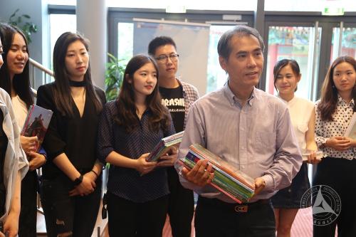 在赠书仪式上,胡芳老师介绍说,为响应国家文化走出去战略,我校国际新闻传播硕士班党支部围绕“传播中华文化、讲好中国故事”这一主题,根据文化中心的实际需求,精心挑选了数十册中法双语图书,如《习近平用典》、《习近平讲故事》、《数说一带一路》、《中法谚语对照手册》、《汉法双语中国神话故事》等书籍,由海外教学实践团将其带到法国,希望以书会友,让法国朋友了解中国的历史与当代、感受中国的文化与风采。
