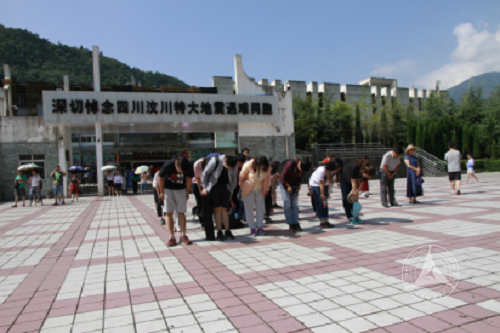 阿坝州的汶川县曾在2008年5月12日经历里氏8.0级特大地震,共有69227人遇难,17923人失踪。来到映秀镇地震纪念馆参观完漩口中学遗址后,老师和同学们在地震纪念石前向遇难者同胞三鞠躬。