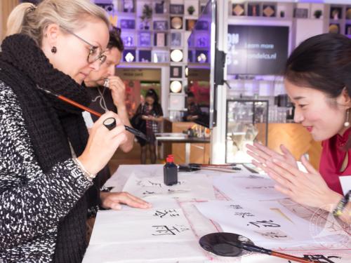 与此同时,“书法工作坊”也在如火如荼地开展着,工作坊吸引了众多的观众前来体验。在现场,格罗宁根孔院的教师谢竞璠弹奏古筝,教师王洋和方阿芳介绍了书法的基本情况和书写规则,并悉心指导体验者书写汉字。伴随着宛转悠扬的古筝曲,体验者们全神贯注地书写汉字,在横折撇捺之间,体验者们对中国的书法文化有了直观而切身的感受。