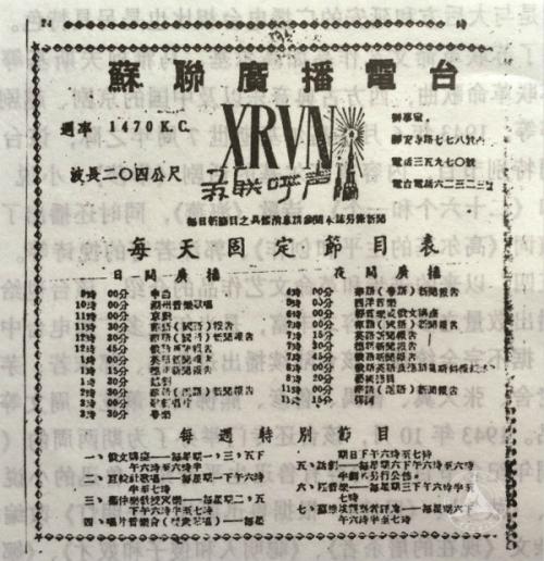 “苏联呼声”广播电台,呼号XRVN,1941年9月27日开始正式播音,使用华语(包括上海话和广州话)以及俄、英、德语播送新闻节目。该台由塔斯社上海分社领导,主要内容有报道苏联人民反法西斯斗争的消息和评论、苏德战争公报、苏维埃国家建设和人民生活情况等,每天上、下午各播音一次,傍晚为特别节目。除新闻节目外,尚有《京剧》《申曲》《越剧》《弹词》《广东音乐》《西洋音乐》以及《艺术节目》《话剧》和《俄文讲座》等栏目。“苏联呼声”电台数量众多的文艺节目,不但与敌伪统治下的广播电台迥然不同,就是与大后方和延安的广播电台相比也是另具特色。该台大量介绍了苏联革命文艺作品如高尔基、马雅柯夫斯基等人的作品,苏联革命歌曲,西方古典音乐以及中国的京剧、越剧、广东音乐等等。1943年6月在高尔基逝世7周年之际,该台播出了纪念周特别节目,内容有高尔基的话剧《华莎》、小说《母亲》片断和《二十六个和一个》、诗歌《海燕》,同时还播出了曹靖华的讲演词《高尔基的生平和创作》、郭沫若写的挽诗等。对于我国“五四”以来进步和革命文艺作品的介绍,该台也给高度重视,播出数量之多,内容之丰富,是当年众多广播电台中罕有的。据不完全统计,该台陆续播出过鲁迅、郭沫若、茅盾、巴金、老舍、张天翼、曹禺、鲁彦、熊佛西、萧乾、周文等人的文艺作品。1943年10月,该台还专门举办了为期两周的《鲁迅逝世7周年纪念节目》,内容有鲁迅生平介绍,鲁迅的小说《阿Q正传》《故乡》《风波》,根据鲁迅原作《长明灯》改编的独幕剧,杂文《现在的屠杀者》《聪明人和傻子和奴才》《娜拉走后怎样》等;还有冯雪峰的《鲁迅与中国民族及文学上的鲁迅主义》,罗果夫的《鲁迅与苏联文学》。在毒雾弥漫的上海广播中,“苏联呼声”的宣传内容,使生活在水深火热中的上海市民耳目一新。重庆《新华日报》1944年1月载文指出:“从苏联电台传送出来的胜利消息和雄壮的国际歌声永远在人们心中共鸣着。这告诉我们,侵略者的寿命已近黄昏日落的时候了。”