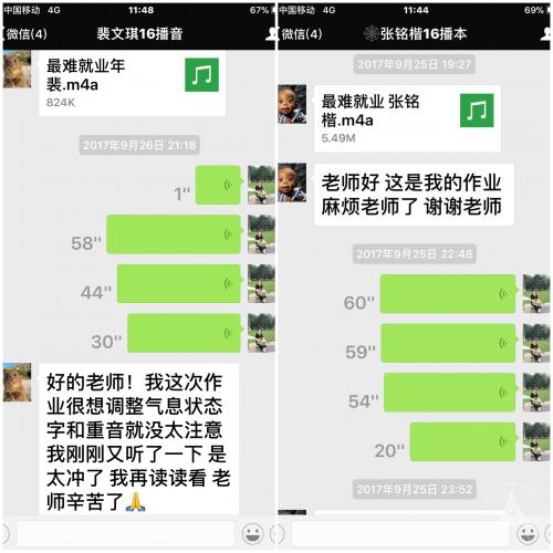 课堂之外,陈老师利用新媒体同学生们充分交流。从最初的e-mail、QQ,到如今的微信,都化作了她的“教学利器”。“做我的学生有点儿‘累’,因为不能闲着。”她笑着说。小班有11位同学,她每次课后都会布置作业,或是发声训练,或是消化课堂内容。大家以语音形式交作业,陈老师则在课前给每一位同学详细反馈。遇到有人不明白时,她便会模仿错误发声,配以详细说明,直到对方真正听懂。工作量之大,可想而知。然而,正是这种方式,实现了课上课下无缝对接,弥补了课堂训练时间有限的不足。