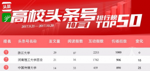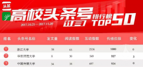 2017年10月,在今日头条教育频道联合教育部“微言教育”推出的全国高校头条号排行榜中,中国传媒大学官方头条号拿下全国第三名的好成绩,其中有四篇文章进入高校头条号热门文章榜TOP10,强势霸屏。