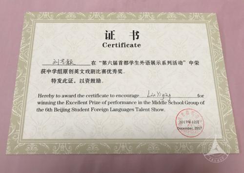 刘艺颖的性格大方有自信,初中的时候,她是学校的文艺部副部长,不仅组织了学校的戏剧节、还亲自改编和导演了《变色龙》这样的经典剧目,组织了学校的电影沙龙,也亲自参与拍摄了一系列的微电影。去年,她原创编剧和导演了一部学生舞台剧——《生日》,这部作品获得了“第六届首都学生外语展示系列活动——英文原创戏剧”最佳编剧奖和优秀剧目奖。