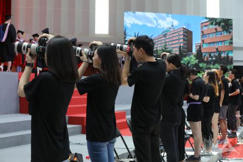 “参与拍摄的2016、2017级图片摄影专业的21名同学真的非常辛苦,向他们致敬!”此次拍摄总协调党委宣传部负责老师表示,为了让每位毕业生拿到满意的照片,相关老师两周前就开始准备,举办培训会,组织学生、看场地、租设备、贴地标,事无巨细,都不敢有丝毫大意,典礼当天也是从早上6:30一直忙到下午4:30。而学生们的认真敬业更是值得称道,“近10斤的设备全部手持拍摄,这二十几位同学端了3个小时,从博士到本科生拨穗环节不间断拍摄,有同学直到最后一名毕业生拨完穗,才第一次放下手中的相机。拍摄结束后还要从将近5万张照片中,整理出1万2千张照片备选。他们的敬业精神值得每一位传媒学子学习!”