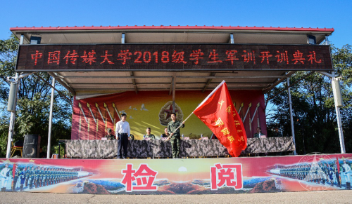 典礼在庄重的国歌声中开始,姜绪范副书记向军训团授中国传媒大学军训团团旗。