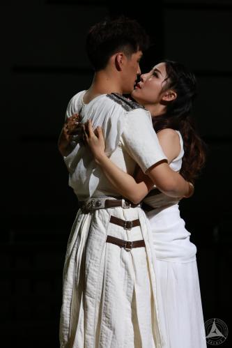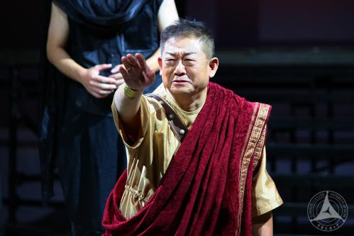 本次演出,在演员阵容上最精彩的一点莫过于“师生同台”。著名配音表演艺术家、我校表演专业负责人李立宏老师饰演克瑞翁一角,贡献了自己的戏剧首秀;我校戏剧影视学院教师韩越老师,饰演欧律狄刻,是剧中克瑞翁的妻子。老师们在台上和学生们相互切磋、相互成全,达到了极高的演出完成度。