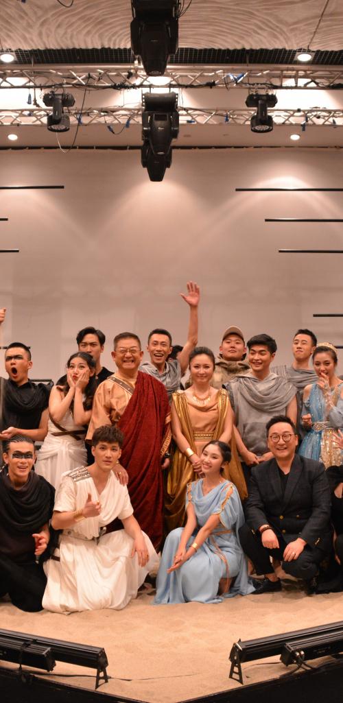 本次演出,在演员阵容上最精彩的一点莫过于“师生同台”。著名配音表演艺术家、我校表演专业负责人李立宏老师饰演克瑞翁一角,贡献了自己的戏剧首秀;我校戏剧影视学院教师韩越老师,饰演欧律狄刻,是剧中克瑞翁的妻子。老师们在台上和学生们相互切磋、相互成全,达到了极高的演出完成度。