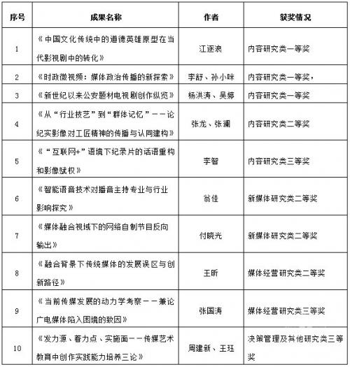 (通讯员 付洁)近日,中国广播电影电视社会组织联合会公布了第十五届全国广播影视学术论文评选结果,共有106篇优秀论文获奖。我校有10篇学术论文在此次评选中获奖,在四项参评分类中皆有斩获。