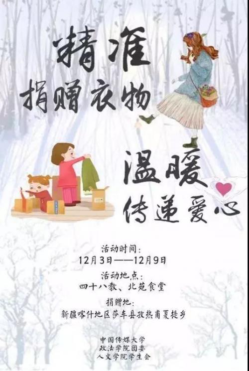 为帮助新疆维吾尔自治区喀什地区莎车县孜热甫夏提乡英迈里村村民解决“不愁穿”的问题,助推贫困地区脱贫攻坚工作,中国传媒大学特此开展“精准捐赠衣物,温暖传递爱心”活动。