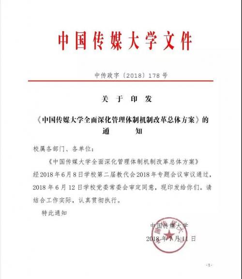 2018年6月8日,学校召开第二届教代会专题会议,审议通过《中国传媒大学全面深化管理体制机制改革总体方案(审议稿)》,全面深化学校管理体制机制改革大幕拉开,同时顺利完成了中层领导干部换届工作,一大批年富力强、想干事、能干事的干部走上领导岗位。通过实施全面深化机关职能部门、直属单位改革,深化学部制改革,深化科研管理体制改革等举措,一个全校上下振奋精神、锐意改革、奋力进取的全新局面正在形成。